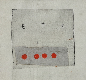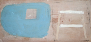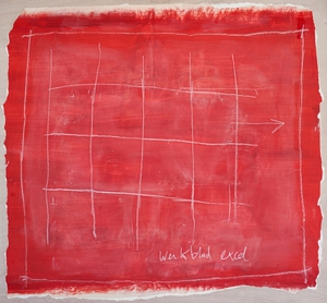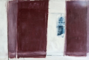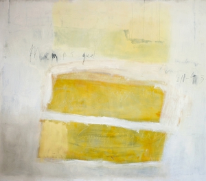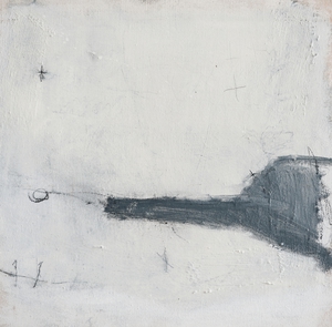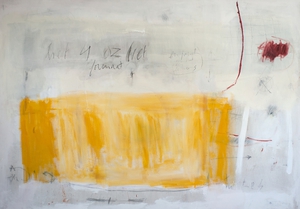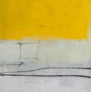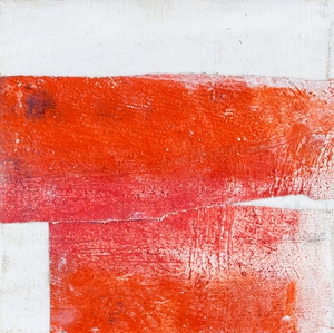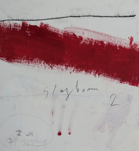 2004Cementgrijs is gemaakt tijdens de verbouwing van onze toenmalige boerderij ; ik was in de ban van cement, stucwerk, betonmolens en al die dingen. Op het doek zit, naast pigmenten, ook daadwerkelijk cement verwerkt, en het markeerpunt in het midden is natuurlijk van menie ! Het doek is een afspiegeling van de werkelijkheid waarin ik me toen bevond.
